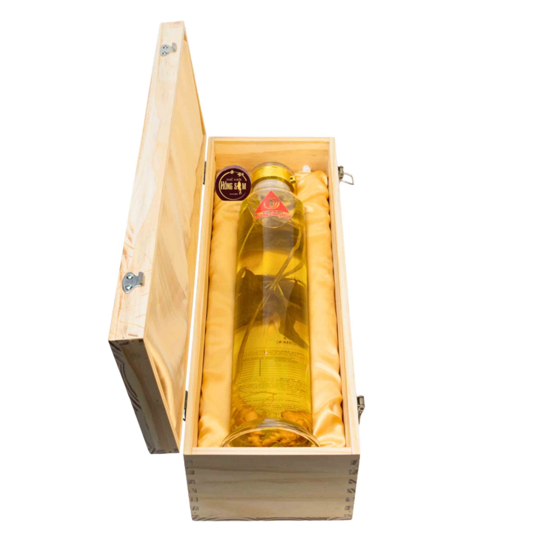 Bình sâm được đóng gói trong hộp gỗ cao cấp, thích hợp làm quà biếu đối tác, sếp lớn, khách VIP trong các dịp Tết, hợp đồng, tri ân khách hàng.