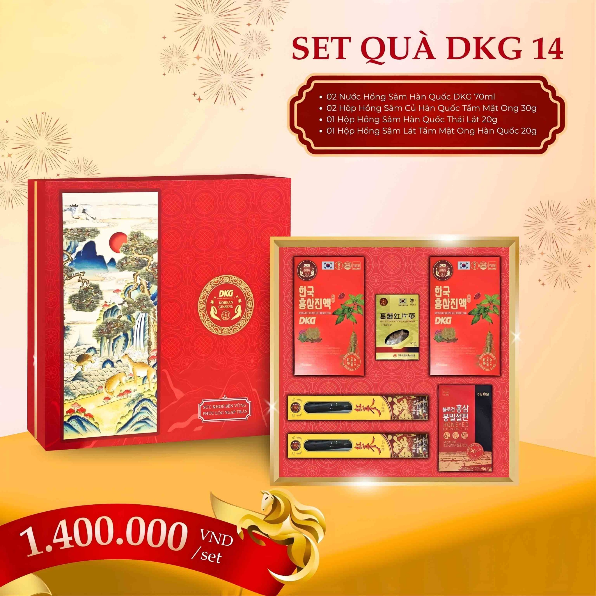 Bộ quà DKG.14 không chỉ có thiết kế đẹp mắt mà còn chứa đựng những sản phẩm chăm sóc sức khỏe chất lượng cao từ Hồng Sâm Hàn Quốc, mang lại nhiều lợi ích cho người sử dụng. Bộ quà bao gồm: