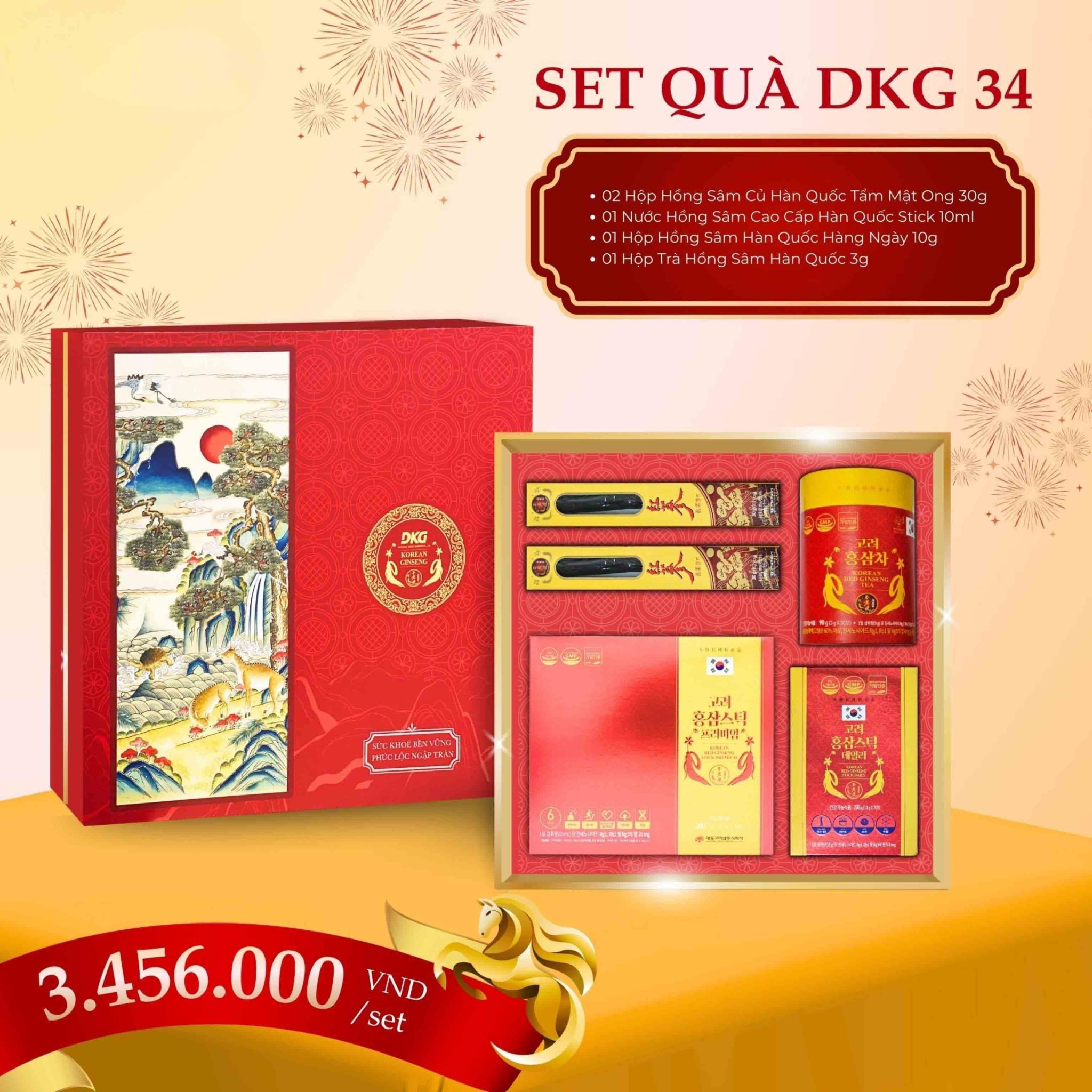 Bộ quà DKG.34 không chỉ có thiết kế đẹp mắt mà còn chứa đựng những sản phẩm chăm sóc sức khỏe chất lượng cao từ Hồng Sâm Hàn Quốc, mang lại nhiều lợi ích cho người sử dụng. Bộ quà bao gồm: