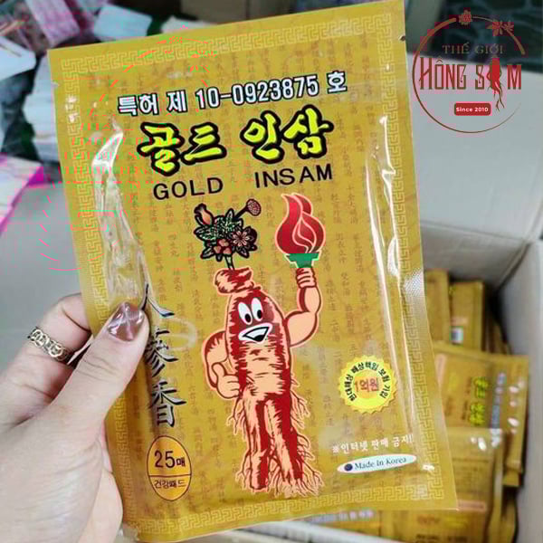 Miếng cao dán hồng sâm màu vàng gói 25 miếng là sản phẩm được chiết xuất chính từ hồng sâm Hàn Quốc, kết hợp các hoạt chất khác cùng các tá dư.ợc khác của Hàn Quốc. Sản phẩm được sản xuất theo công ngệ và tiêu chuẩn GPP của Hàn Quốc, sản phẩm được người tiêu dùng đáng giá rất cao về chất lượng và độ tiện dụng cao khi dùng. Ngày nay sản phẩm đã có mặt tại hầu hết các quốc gia có quan hệ kinh tế với Hàn Quốc trong đó có Việt Nam.