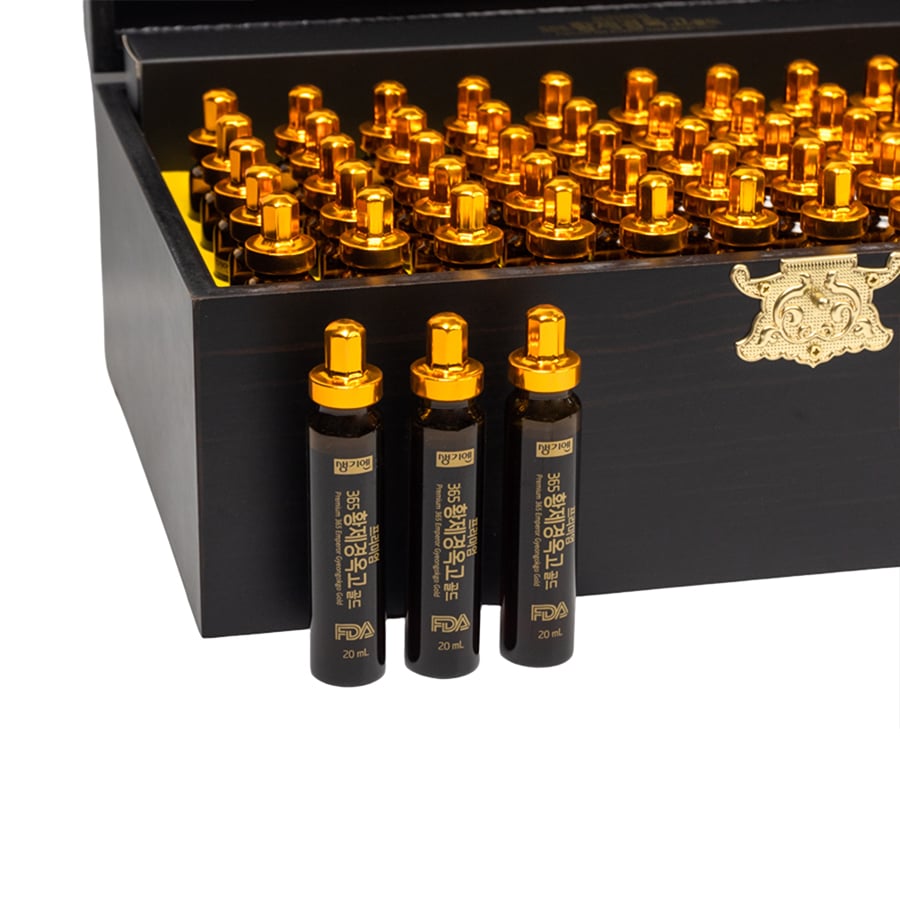 Tinh chất đông trùng hạ thảo Hàn Quốc 365 cao cấp tăng lực hộp gỗ 60 ống là hỗn hợp chiết xuất từ các loại thực vật quý hiếm xuất xứ từ Hàn Quốc. Đây là sản phẩm cao cấp dùng để bồi bổ sức khỏe.